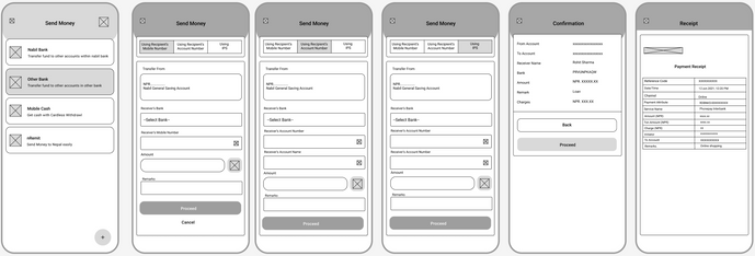 Low-Fidelity Wireframes for "Send Money" feature Development.